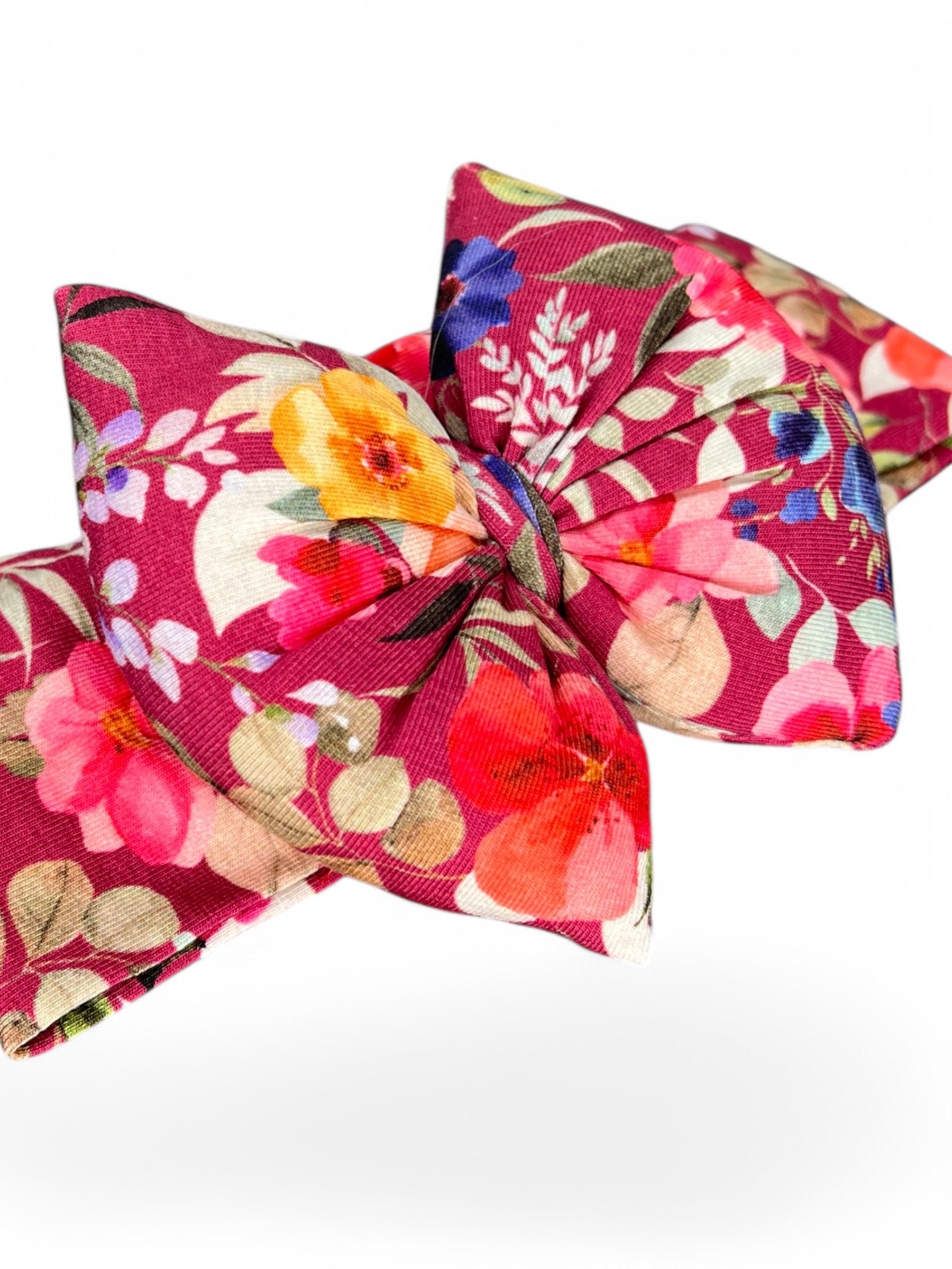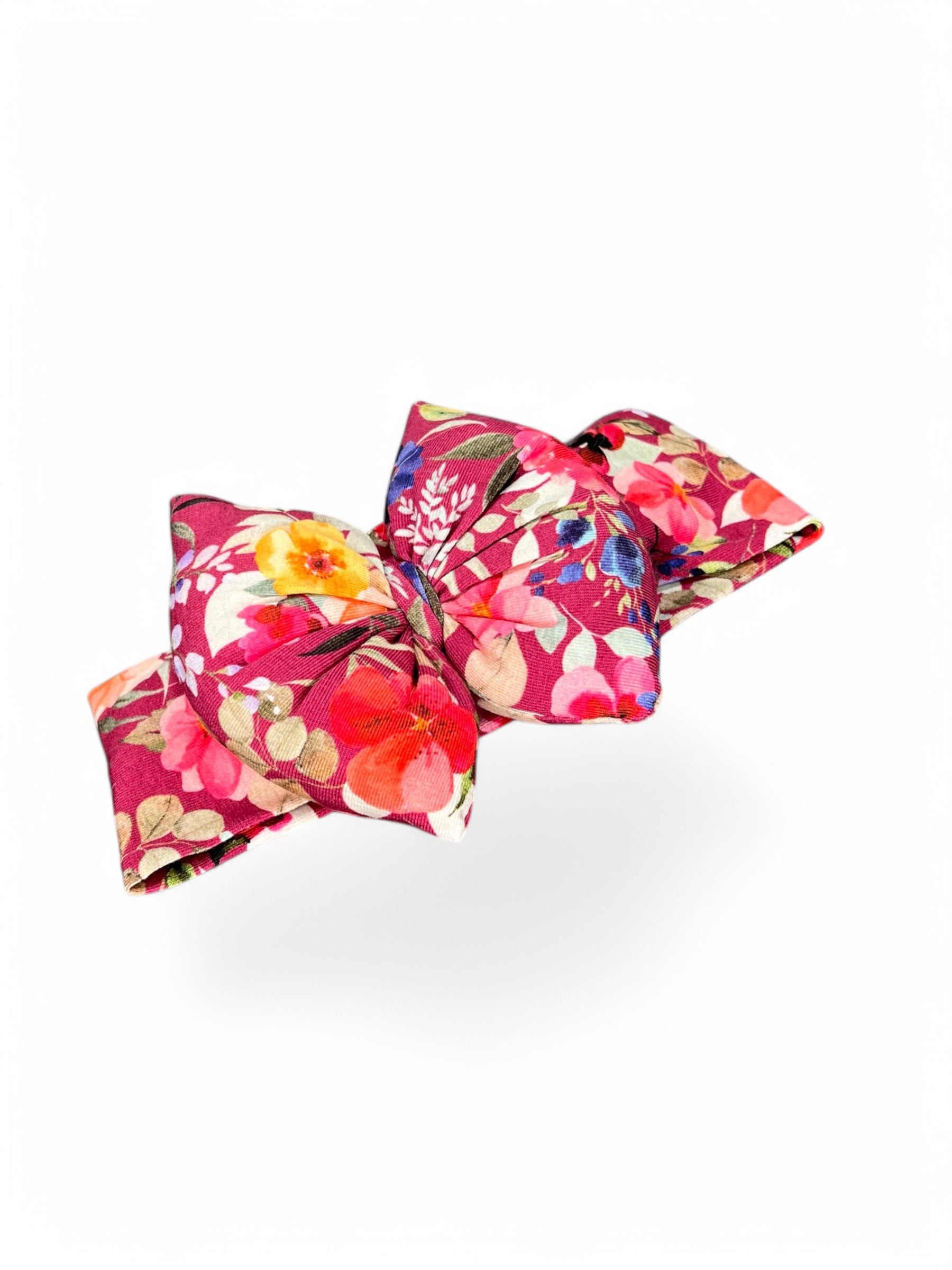 Fjongo pambuku i punuar me dorë me ngjyrë të kuqe krimson dhe print me lule, me harqe të fryrë.