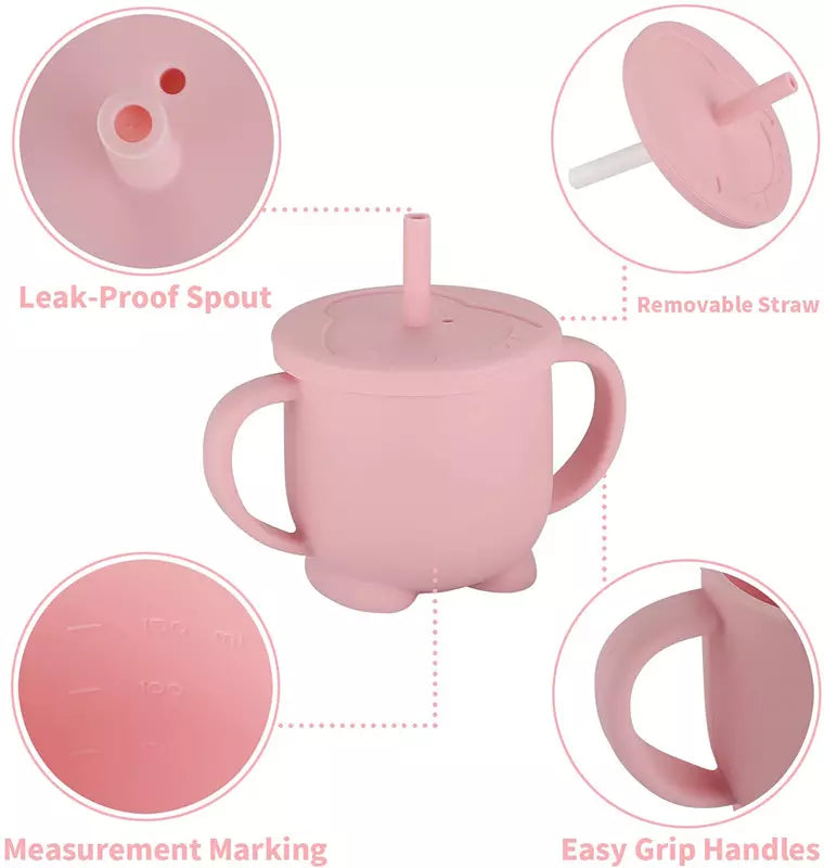 Kupëja jonë silikoni 2 në 1 me doreza ka 2 kapakë për ta përdorur sipas dëshirës tuaj! Një kapak ka një shtrydhës dhe e kthen atë në një kupë ideale për duar të vogla! Ndërsa kapaku i dytë e kthen atë në një kupë për snacks!