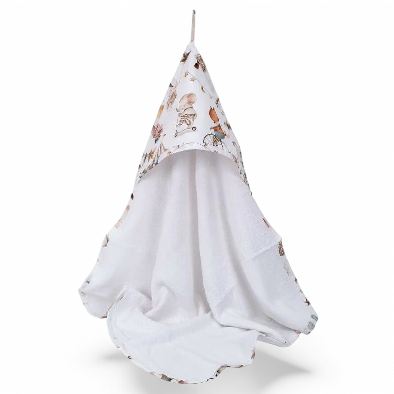 Peshqir-mantil i butë për bebe, prej pambuku Oeko-Tex me printim Circus.