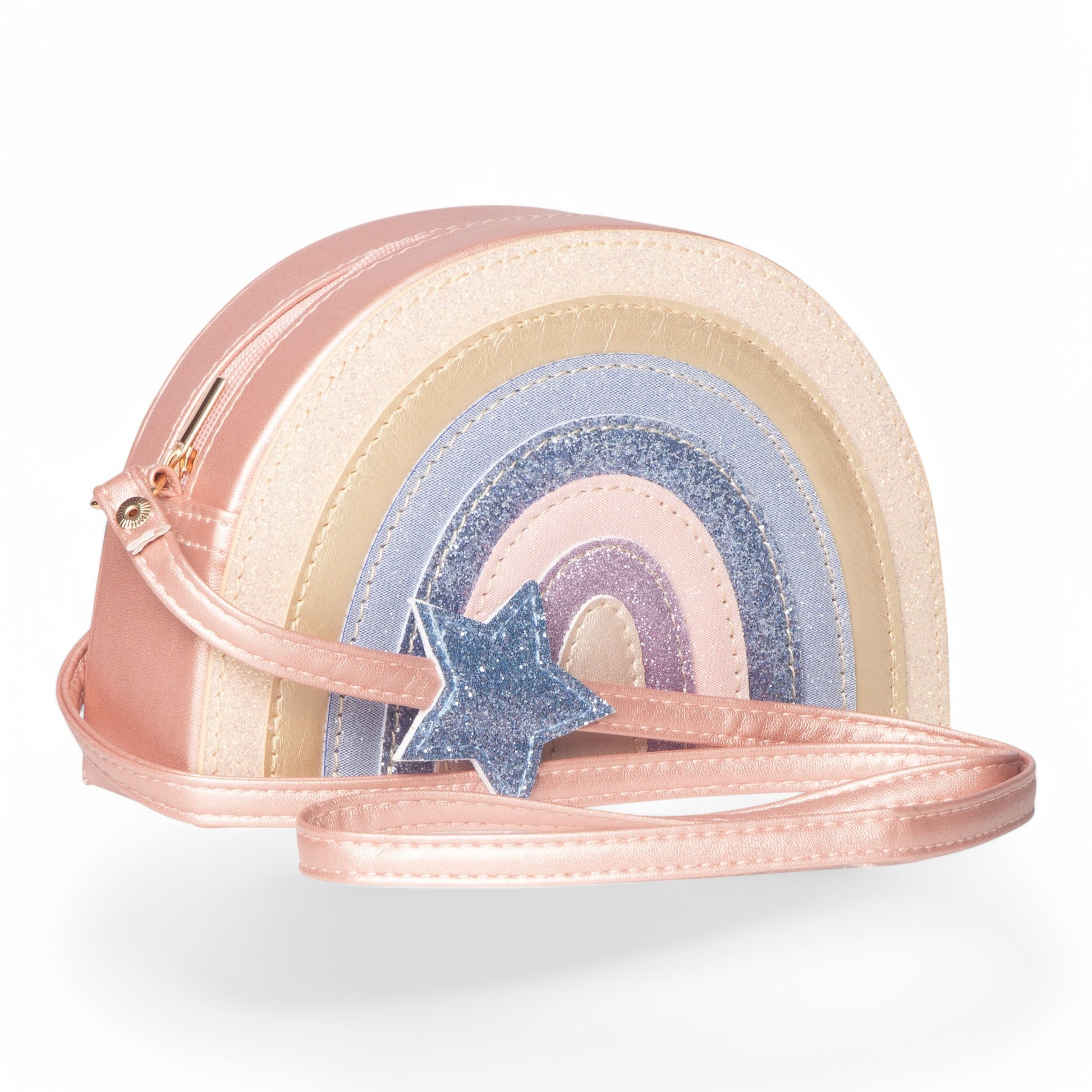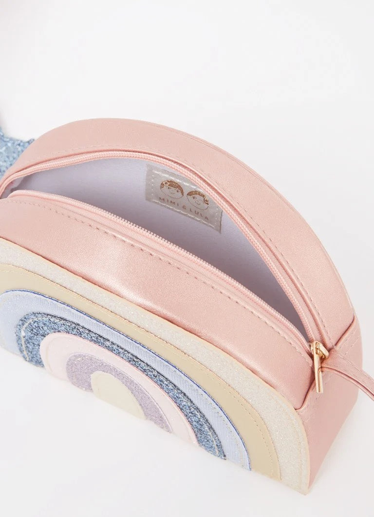 Bëni që ëndrrat e fëmijërisë së tyre të bëhen realitet me këtë çantë super ëndërrimtare me ylber! E bërë nga kombinimi më i bukur i ngjyrës rozë perlë, glitter dhe pëlhurave metalike mat, kjo çantë argëtuese do të sigurojë që dita e tyre të jetë më e ndritshme!