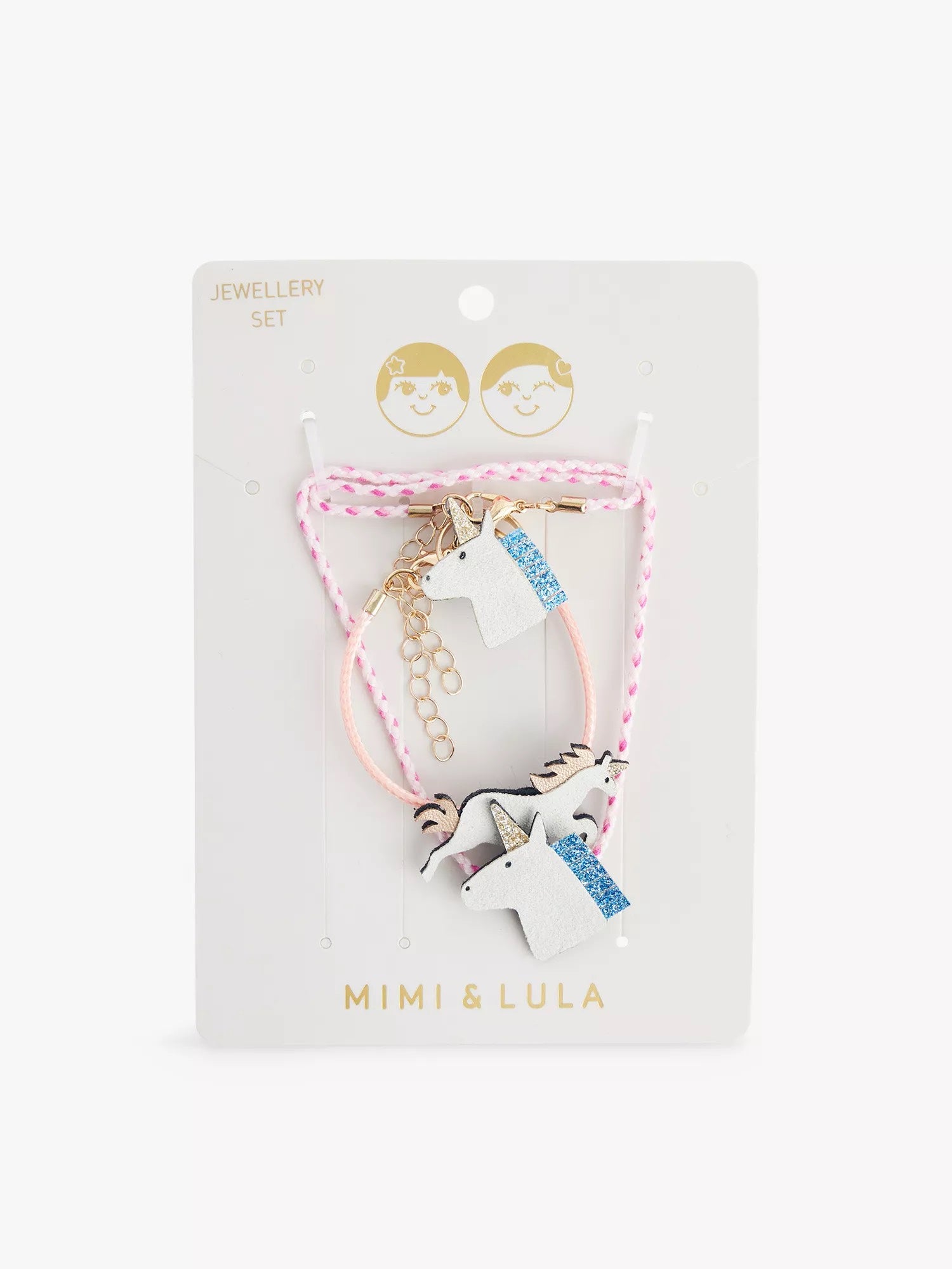 • Seti përmban një necklace, një byzylyk dhe një unazë me unikornë të vegjël të bërë nga pëlhura e butë lëkure me detaje glitter