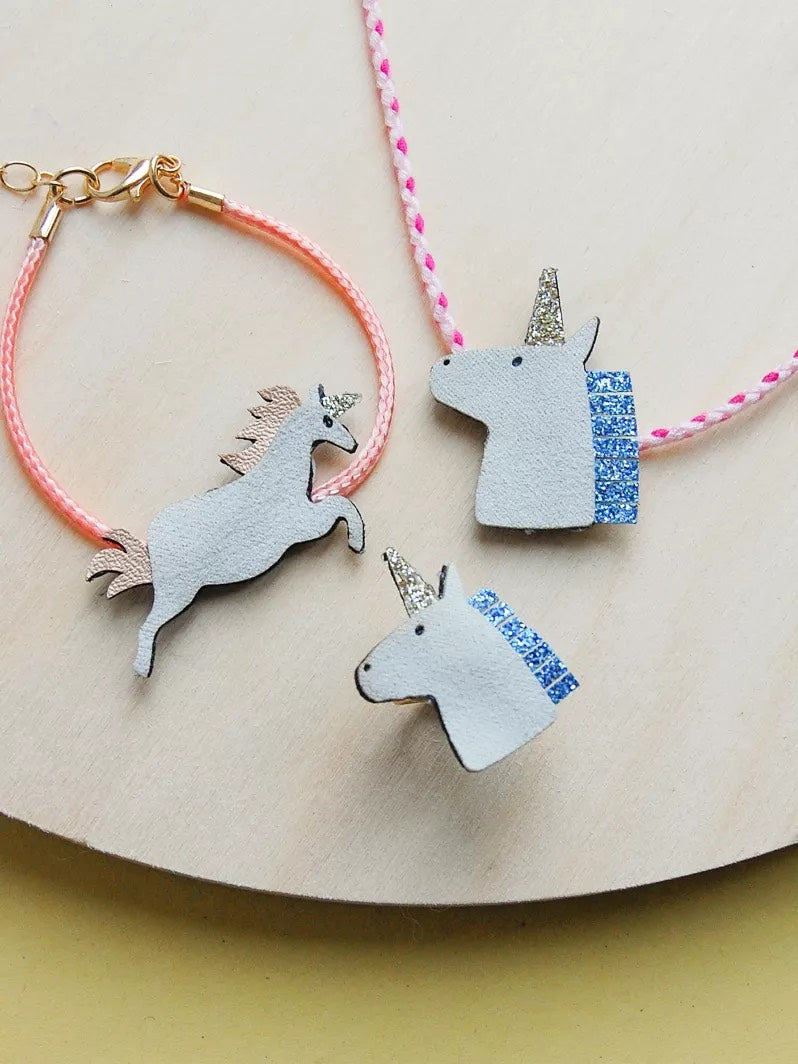 Jemi shumë të kënaqur që ju prezantojmë... Setin e Bizhuterive Unikorn! Fëmijët do ta adhurojnë këtë set aksesorësh shkëlqyes, të përsosur për të plotësuar veshjen e ditës! Ky set i bukur është një ide e shkëlqyer dhurate për çdo rast.